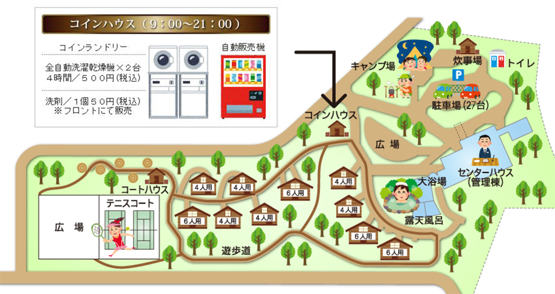 | 設備 | ○フリーテントサイト(縦5.4m×横3.6m)※砂利敷 ○キャンプサイト専用炊事場 ○屋外トイレ ○コインハウス(利用時間/9:00~21:00) |